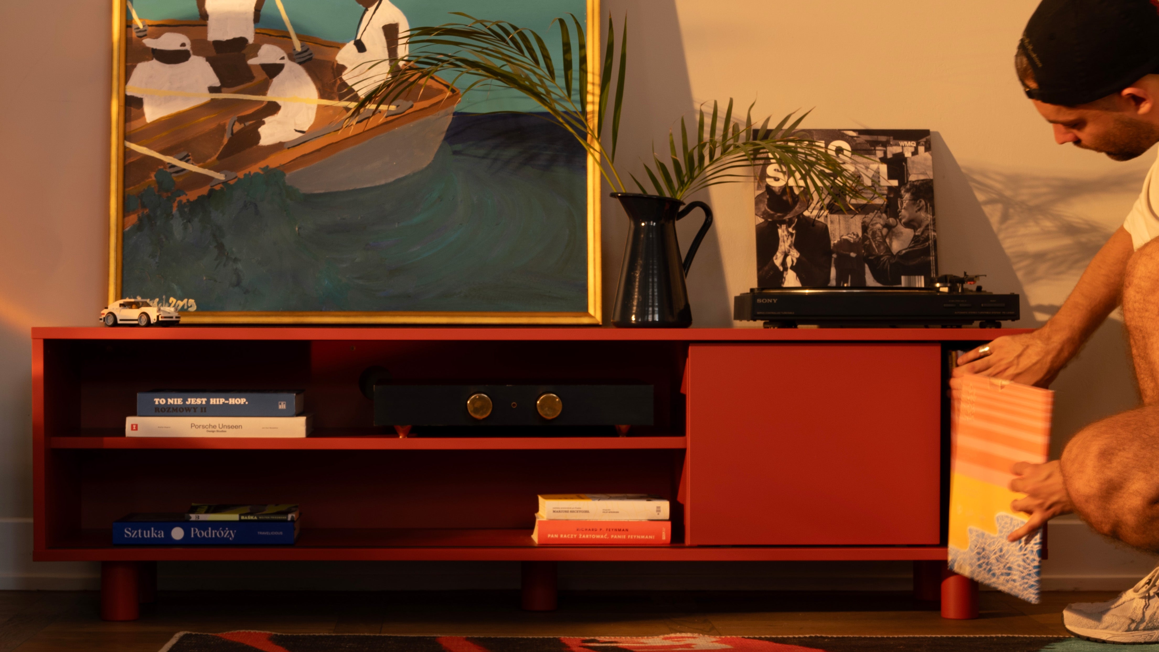 Sliding doors for hassle-free storage, with a side shelf that's perfect for your vinyl collection or other favorite items